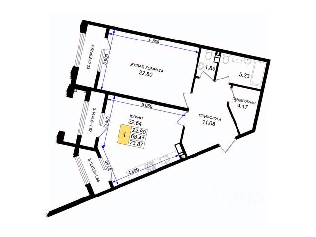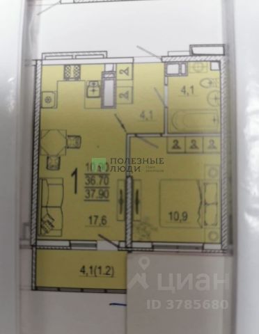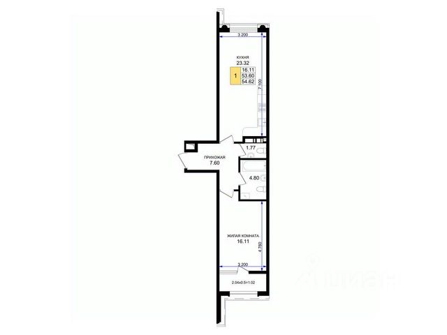 Квартира просторная и светлая, с кухней гостиной 19,3 кв. м., санузлом 4,7 кв. м., спальней 16,8 кв. м., прихожей 6,4 кв. м. и просторной лоджией .