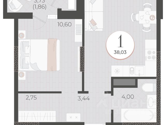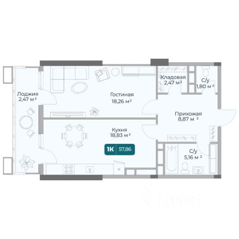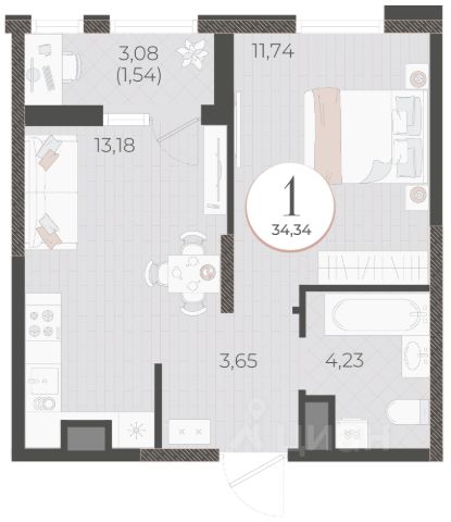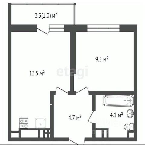 Общая площадь - 43,2 кв.м