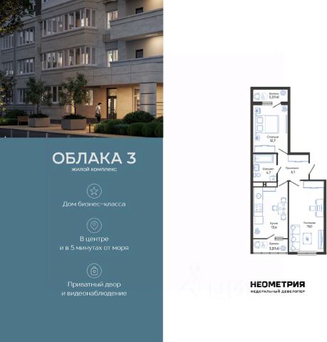 Продается квартира в жилом комплексе "Облака" от федерального девелопера "Неометрия". Современный жилой комплекс расположен на границе Южного и Центрального районов Новороссийска — в развитой, благоустроенной локации всего в 5 минутах езды от моря и центра города. Здесь мягкий климат, чистый воздух и гармоничное сочетание природы и городской инфраструктуры. Всё для комфортной жизни: • Закрытая дворовая территория без машин; • Подземный паркинг с доступом на лифте; • Колясочные в каждом подъезде; • Сквозные входные группы на уровне земли; • Просторные квартиры с видами на горы и море. Современное благоустройство: Во дворах реализована концепция "активити-парка" — это большое зелёное пространство для отдыха и занятий спортом: • Детские площадки, разделенные по возрасту ребенка; • Зоны воркаута, йоги и командных игр, внесенные за периметр двора; • Озеленённые аллеи и уютные места для прогулок; • Общественные огороды для семейного досуга. Развитая инфраструктура в шаговой доступности: • 5 детских садов; • 3 школы; • 5 высших учебных заведений; • 2 поликлиники; • 2 крупных торговых центра; • Супермаркеты и магазины; • Удобные остановки общественного транспорта. Застройка ведётся по 214-ФЗ с использованием эскроу-счетов, что обеспечивает безопасность сделки и прозрачность на всех этапах. • 3 очередь проекта — сдача в IV квартале 2026 года, класс бизнес • 2 очередь — сдана в 2024 г., класс комфорт-плюс • 1 очередь — сдана в 2020 г., класс комфорт-плюс