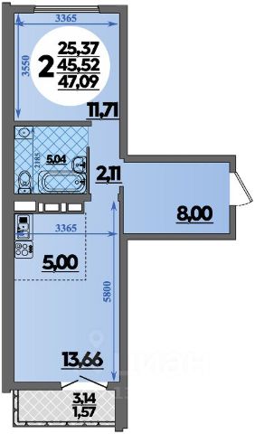 Общая площадь 55,78 кв.м