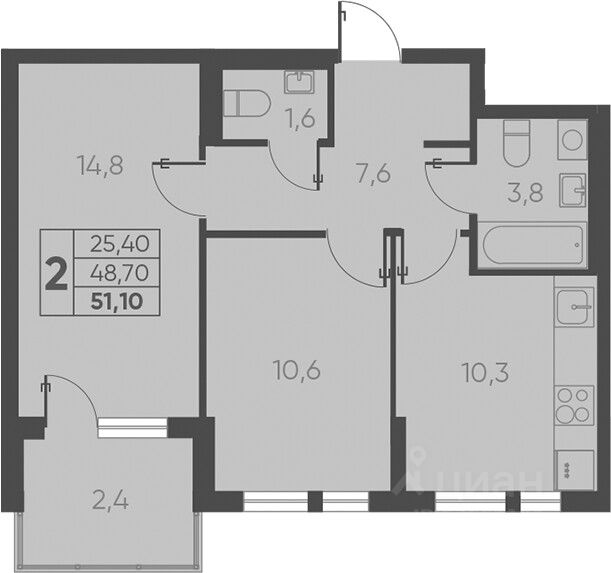 Санузел раздел.-ванная 2,8 кв.м., туалет 1,5 кв.м.