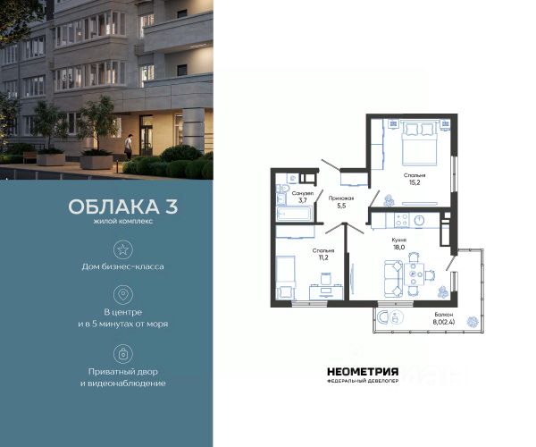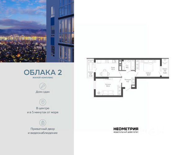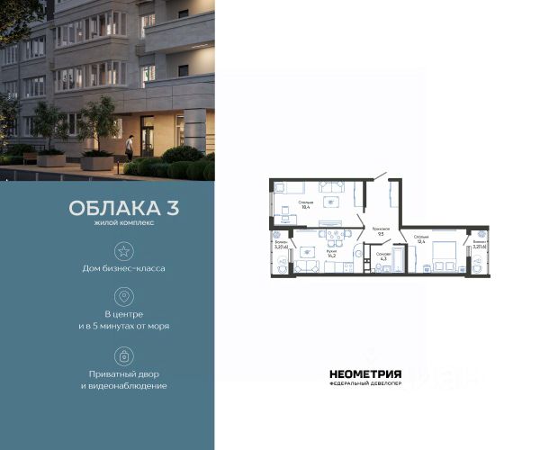 Проект включает в себя 2 дома высотой 23-24 этажа. В подъездах выполнена дизайнерская отделка в светлой цветовой гамме, для удобства жителей в местах общего пользования предусмотрена навигация. В каждой секции предусмотрены помещения для хранения велосипедов и колясок с обустроенным местом для мойки колес и лап домашних животных. Покупателям в ЖК предложено множество планировочных решений: в наличии квартиры, как классического типа, так и европланировки. На балконах и лоджиях выполнено витражное остекление. Из окон открывается шикарный вид на город и море. Квартиры сдаются без отделки. Двор комплекса закрыт от автомобилей и случайных прохожих. Для автовладельцев предусмотрен двухуровневый подземный паркинг на 650 мест. По всему периметру двора размещены видеокамеры. Внутренний двор благоустроен: предусмотрены пешеходные дорожки, скамейки и деревянные мини-беседки с розетками. Также спроектированы детские игровые площадки, уличные тренажеры и спортивная площадка для командных игр. ЖК расположен в южной части Новороссийска, на пересечении Мысхакского шоссе и улицы Куникова. Инфраструктура района развита: в пешей доступности детские сады, школы, аптеки и поликлиники, магазины и парки. Купить 2-комнатную квартиру 2-комнатных квартир в Облака в Новороссийске.