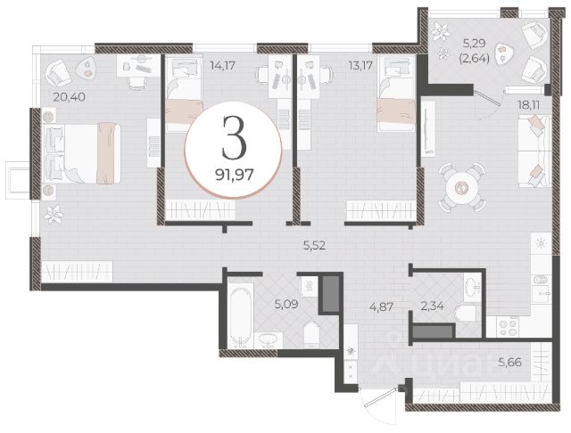 Общая площадь 91.49 кв.м,