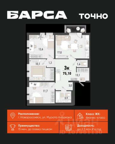 Уникальная 3-комнатная Квартира 97 площадью 82,79 кв.м. в ЖК "Золотой Берег" — 800 метров или 10 минут до моря, современный дизайн и все условия для комфортной жизни! Предлагаем вам идеальную квартиру в жилом комплексе "Золотой Берег" от компании "СРЕДАстрой". Это уникальное предложение сочетает в себе все, что нужно для удобной и комфортной жизни в одном из лучших районов города. Преимущества квартиры: • 800 метров или 10 минут до моря — наслаждайтесь свежим морским воздухом, ежедневным завораживающим видом на море, живописным закатом и это каждый день. • Ипотека от 3,5 % — доступные условия для приобретения квартиры/ жилья вашей мечты. • Рядом с домом: 2 детских сада, 4 школы — всё необходимое для развития и обучения ваших детей в шаговой доступности. • Детские площадки во дворе без машин — безопасная среда для игр и отдыха. • Выбор отделки: квартиры с качественной отделкой или качественная ПЧО/ без отделки, что позволит вам создать интерьер по своему вкусу. • Современный и красивый дизайн домов, подъездных холов — эстетика и стиль, продуманные до мелочей. Инфраструктура: • В шаговой доступности: гипермаркет Лента, магазины, кафе, аптеки, фитнес-центры — всё, что нужно для комфортной жизни. • Тип дома: монолитно-кирпичный, построенный по современным технологиям, 17/ 16 этажей с прилегающими торгово-офисными помещениями. • Паркинг: -1 этаж подземный отапливаемый паркинг с видеонаблюдением 24/7. Прямой доступ на лифте — удобно и безопасно.закрытая территория всего комплекса, нет посторонних людей. Описание квартиры: • Просторные комнаты с продуманной планировкой и панорамными окнами. • Возможность индивидуального дизайна интерьера или готовая качественная отделка. • Современные инженерные системы и высококачественные материалы. ЖК "Золотой Берег" — это сочетание высокого качества строительства, удобной инфраструктуры и прекрасного расположения. Здесь каждый найдет всё, что нужно для комфортной и счастливой жизни.