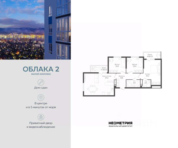 Проект включает в себя 2 дома высотой 18-21 этаж. В подъездах выполнена дизайнерская отделка в светлой цветовой гамме, для удобства жителей в местах общего пользования предусмотрена навигация. В каждой секции предусмотрены помещения для хранения велосипедов и колясок с обустроенным местом для мойки колес и лап домашних животных. Покупателям в ЖК предложено множество планировочных решений: в наличии квартиры, как классического типа, так и европланировки. На балконах и лоджиях выполнено витражное остекление. Из окон открывается шикарный вид на город и море. Квартиры сдаются без отделки. Двор комплекса закрыт от автомобилей и случайных прохожих. Для автовладельцев предусмотрен двухуровневый подземный паркинг на 650 мест. По всему периметру двора размещены видеокамеры. Внутренний двор благоустроен: предусмотрены пешеходные дорожки, скамейки и деревянные мини-беседки с розетками. Также спроектированы детские игровые площадки, уличные тренажеры и спортивная площадка для командных игр. Жилой комплекс расположен в южной части Новороссийска, на пересечении Мысхакского шоссе и улицы Куникова. Инфраструктура района развита: в пешей доступности детские сады, школы, аптеки и поликлиники, магазины и парки. Продается 3-комнатная квартира первичка в Новороссийске.