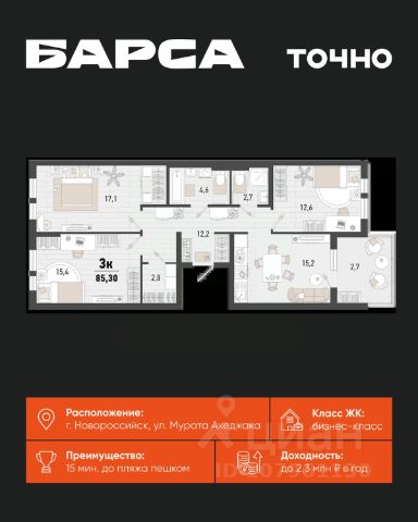 Жилой комплекс "Барса" включает в себя 5 корпусов переменной этажности: от 15 до 24 этажей. Дом возводится по долговечной монолитной технологии. Фасады облицованы кирпичом. В проекте выполнена дизайнерская отделка входных групп, установлены современные скоростные лифты. В жилом комплексе "Барса" предложено множество планировочных решений: в наличии квартиры, как классического типа, так и европланировки. Сдаются они с чистовой отделкой, панорамными окнами и высотой потолков 2,66 метра. Комплекс находится под охраной и видеонаблюдением. Территория комплекса благоустроена, организованы аллеи для прогулок, детские площадки и спортивные зоны. Двор комплекса закрыт от автомобилей. Для автовладельцев предусмотрен отдельный многоуровневый паркинг. Жилой комплекс "Барса" расположен в Южном районе Новороссийска. В пешей доступности работают: школа, поликлиника, детский сад, магазины, отделения банков и магазины. До центра Новороссийска — 15 минут транспортом.