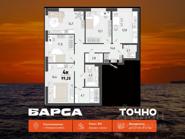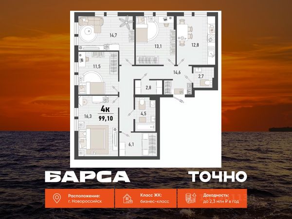Продаётся 4-комнатная квартира в строящемся доме (Дом 3В), срок сдачи: II-кв. 2027, общей площадью 99.1 кв.м., на 15 этаже. Жилой комплекс "Барса" расположился в самом живописном Южном районе Новороссийска, всего в 15 минутах ходьбы от пляжа "Алексино". Море будет видно даже из окон невысоких этажей. Проект объединяет просторные квартиры с панорамными окнами, продуманные зоны отдыха и площадки для спорта, прогулочный бульвар, беседки и уникальные арт-объекты. В жилом комплексе запланированы детский сад на 380 мест и школа на 1 750 мест. Больше не нужно выбирать между жизнью на курорте и в мегаполисе. "Барса" — новый проект для безупречной жизни людей на побережье!