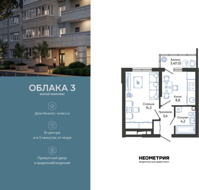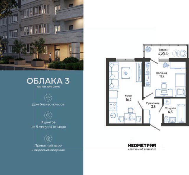 Продается квартира в жилом комплексе "Облака" от федерального девелопера "Неометрия". Современный жилой комплекс расположен на границе Южного и Центрального районов Новороссийска — в развитой, благоустроенной локации всего в 5 минутах езды от моря и центра города. Здесь мягкий климат, чистый воздух и гармоничное сочетание природы и городской инфраструктуры. Всё для комфортной жизни: • Закрытая дворовая территория без машин; • Подземный паркинг с доступом на лифте; • Колясочные в каждом подъезде; • Сквозные входные группы на уровне земли; • Просторные квартиры с видами на горы и море. Современное благоустройство: Во дворах реализована концепция "активити-парка" — это большое зелёное пространство для отдыха и занятий спортом: • Детские площадки, разделенные по возрасту ребенка; • Зоны воркаута, йоги и командных игр, внесенные за периметр двора; • Озеленённые аллеи и уютные места для прогулок; • Общественные огороды для семейного досуга. Развитая инфраструктура в шаговой доступности: • 5 детских садов; • 3 школы; • 5 высших учебных заведений; • 2 поликлиники; • 2 крупных торговых центра; • Супермаркеты и магазины; • Удобные остановки общественного транспорта. Застройка ведётся по 214-ФЗ с использованием эскроу-счетов, что обеспечивает безопасность сделки и прозрачность на всех этапах. • 3 очередь проекта — сдача в IV квартале 2026 года, класс бизнес • 2 очередь — сдана в 2024 г., класс комфорт-плюс • 1 очередь — сдана в 2020 г., класс комфорт-плюс #Z70g1S