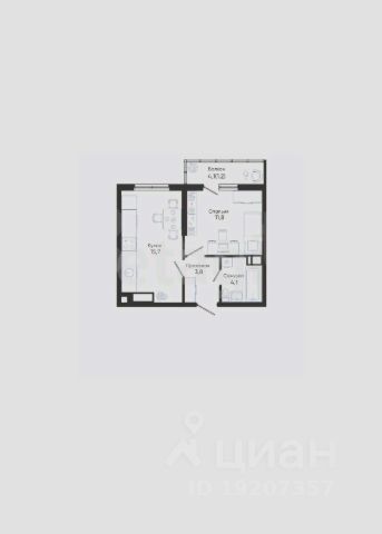 Общая площадь квартиры 41.8 кв.м., из которых комнаты 17.2 и 10 кв.м., сан. узел 3 кв.м., кухня 6 кв.м., прихожая 2,6 кв.м., кладовая 2 кв.м. + балкон 3 кв.м.