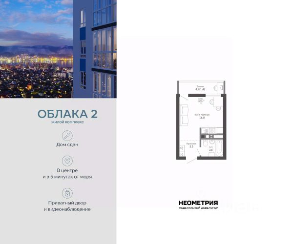 Проект включает в себя 2 дома высотой 23-24 этажа. В подъездах выполнена дизайнерская отделка в светлой цветовой гамме, для удобства жителей в местах общего пользования предусмотрена навигация. В каждой секции предусмотрены помещения для хранения велосипедов и колясок с обустроенным местом для мойки колес и лап домашних животных. Покупателям в ЖК предложено множество планировочных решений: в наличии квартиры, как классического типа, так и европланировки. На балконах и лоджиях выполнено витражное остекление. Из окон открывается шикарный вид на город и море. Квартиры сдаются без отделки. Двор комплекса закрыт от автомобилей и случайных прохожих. Для автовладельцев предусмотрен двухуровневый подземный паркинг на 650 мест. По всему периметру двора размещены видеокамеры. Внутренний двор благоустроен: предусмотрены пешеходные дорожки, скамейки и деревянные мини-беседки с розетками. Также спроектированы детские игровые площадки, уличные тренажеры и спортивная площадка для командных игр. ЖК расположен в южной части Новороссийска, на пересечении Мысхакского шоссе и улицы Куникова. Инфраструктура района развита: в пешей доступности детские сады, школы, аптеки и поликлиники, магазины и парки.