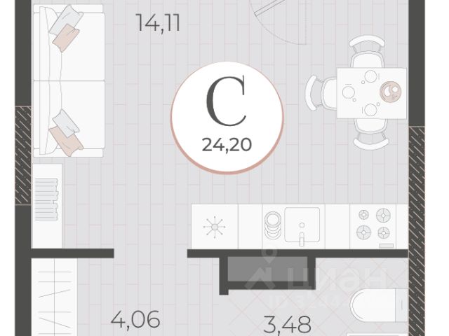Квартира имеет общую площадь 12.6 кв.м., из которых: кухонная зона - 3 кв.м, жилая зона - 7 кв.м., сан.узел 2.6 кв.м.