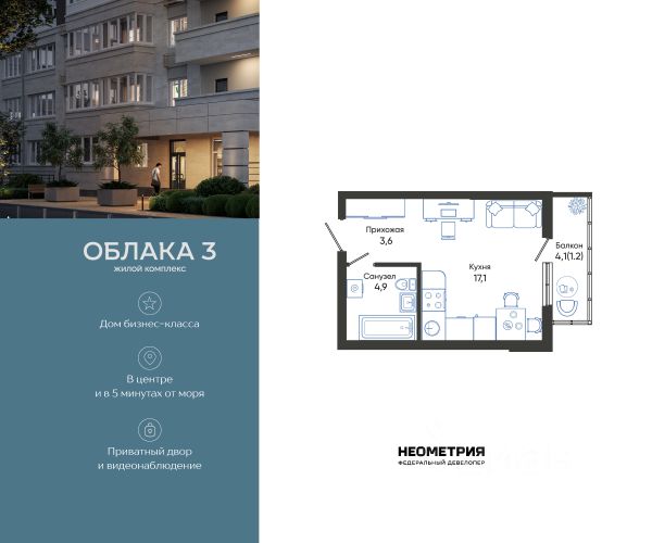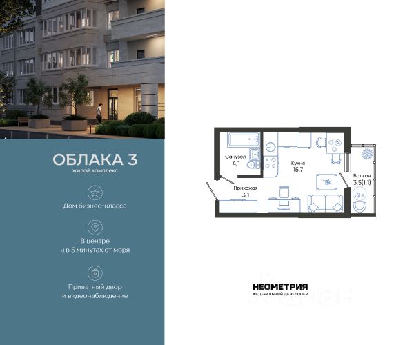 Продается квартира в жилом комплексе "Облака" от федерального девелопера "Неометрия". Современный жилой комплекс расположен на границе Южного и Центрального районов Новороссийска — в развитой, благоустроенной локации всего в 5 минутах езды от моря и центра города. Здесь мягкий климат, чистый воздух и гармоничное сочетание природы и городской инфраструктуры. Всё для комфортной жизни: • Закрытая дворовая территория без машин; • Подземный паркинг с доступом на лифте; • Колясочные в каждом подъезде; • Сквозные входные группы на уровне земли; • Просторные квартиры с видами на горы и море. Современное благоустройство: Во дворах реализована концепция "активити-парка" — это большое зелёное пространство для отдыха и занятий спортом: • Детские площадки, разделенные по возрасту ребенка; • Зоны воркаута, йоги и командных игр, внесенные за периметр двора; • Озеленённые аллеи и уютные места для прогулок; • Общественные огороды для семейного досуга. Развитая инфраструктура в шаговой доступности: • 5 детских садов; • 3 школы; • 5 высших учебных заведений; • 2 поликлиники; • 2 крупных торговых центра; • Супермаркеты и магазины; • Удобные остановки общественного транспорта. Застройка ведётся по 214-ФЗ с использованием эскроу-счетов, что обеспечивает безопасность сделки и прозрачность на всех этапах. • 3 очередь проекта — сдача в IV квартале 2026 года, класс бизнес • 2 очередь — сдана в 2024 г., класс комфорт-плюс • 1 очередь — сдана в 2020 г., класс комфорт-плюс