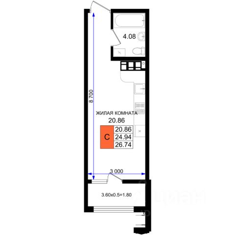 • Санузел под ключ: ванна с декоративным экраном, удобная раковина с пьедесталом, смесители, полотенцесушитель. На полу керамогранит
