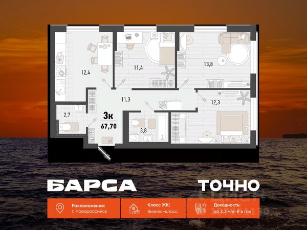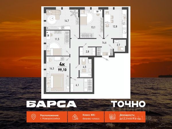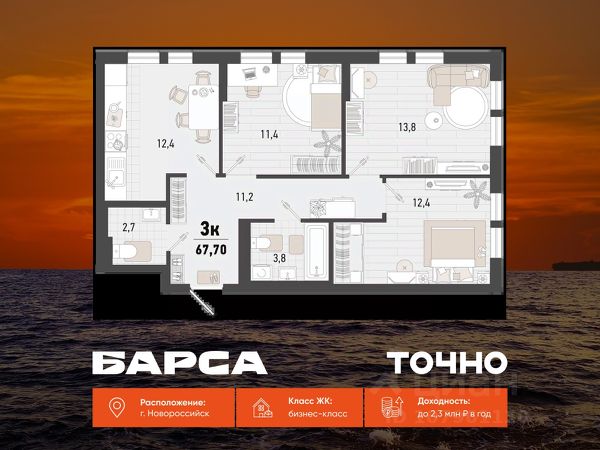 Продаётся 2-комнатная квартира в строящемся доме (Дом 1В), срок сдачи: IV-кв. 2026, общей площадью 55.2 кв.м., на 4 этаже. Жилой комплекс "Барса" расположился в самом живописном Южном районе Новороссийска, всего в 15 минутах ходьбы от пляжа "Алексино". Море будет видно даже из окон невысоких этажей. Проект объединяет просторные квартиры с панорамными окнами, продуманные зоны отдыха и площадки для спорта, прогулочный бульвар, беседки и уникальные арт-объекты. В жилом комплексе запланированы детский сад на 380 мест и школа на 1 750 мест. Больше не нужно выбирать между жизнью на курорте и в мегаполисе. "Барса" — новый проект для безупречной жизни людей на побережье!