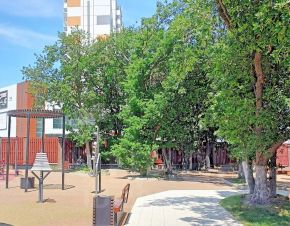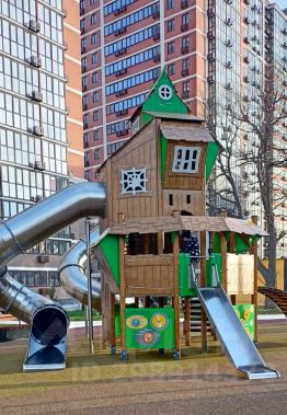 Просторный двор с тенистыми дубами, детской площадкой, качелями и спортплощадками. Рядом остановка транспорта, спорткомплекс "Патриот", супермаркет Лента, Магнит, Пятерочка.