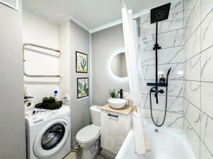 Дизайнерский ремонт и новая мебель. Есть всё необходимое для проживания в повышенном комфорте. Чай, кофе, сахар, полотенца, мыло и т. п. Всё есть. Очень выгодная локация. В пешей доступности море, гипермаркет "Лента", кафе, рестораны, прогулочные зоны... Даже играя с детьми во дворе, можно наслаждаться видами на море и горы. Во дворе есть тренажеры, баскетбольная и детская площадки.