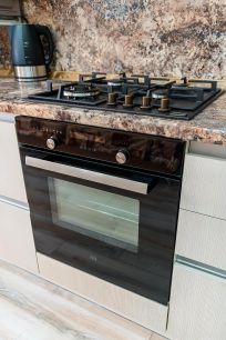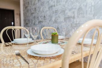 Кухня: вся необходимая техника (холодильник, плита, микроволновка, чайник, духовка, посудомоечная машина) и посуда.