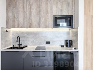 Кухонная зона со всем необходимым: варочная поверхность, чайник, микроволновка, холодильник, посуда и кухонная утварь;
