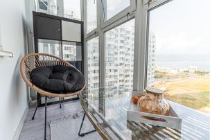 Общая площадь 62 кв.м с двумя изолированными комнатами и тремя застеклёнными балконами с москитными сетками — два с видом на море, один во двор