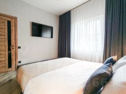 Чтобы вы могли отдохнуть после долгого дня, в номере есть телевизор и халат. Оснащение зависит от выбранной категории номера.