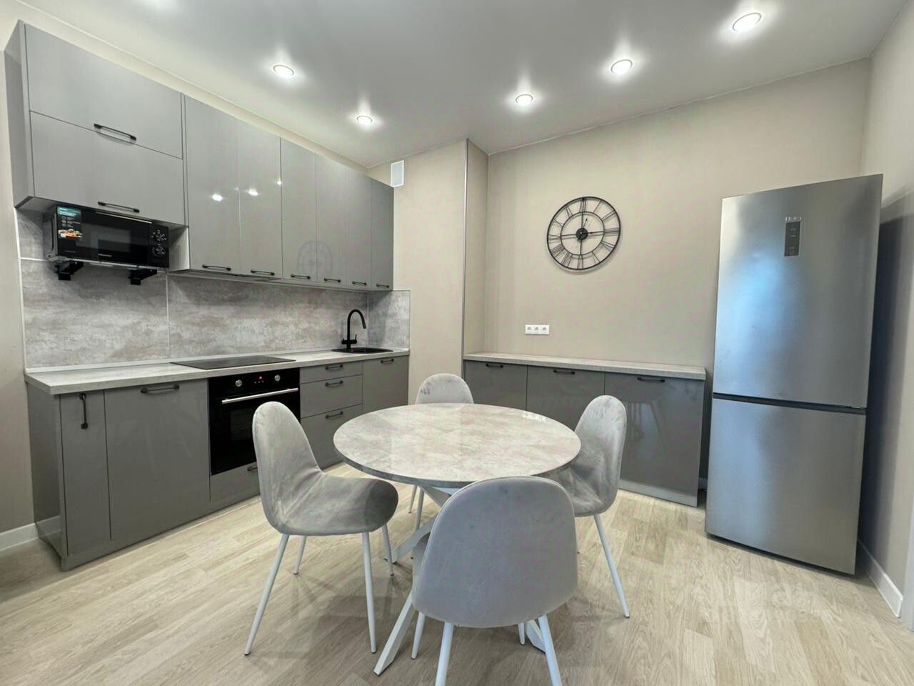 - Удобная кухонная зона со всеми удобствами. Оборудованная посудой и техникой кухня, где есть варочная панель, духовой шкаф, посудомоечная машина, холодильник, СВЧ, чайник.
