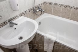 В ванной комнате: полотенца, туалетные принадлежности, фен. Установлена ванна.
