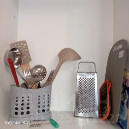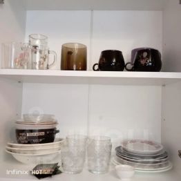 - Посуда (кастрюли, сковородка, тарелки, вилки, ложки, ножи, стаканы, бокалы для шампанского, кружки, разд. доска, терка);