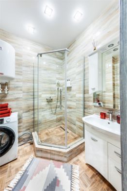 душ, стиральная машина, полотенца, шампунь, мыло, фен, утюг, гладильная доска.