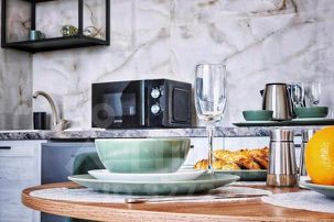 -Оборудованная посудой и техникой кухня, где есть плита, холодильник, свч и чайник,