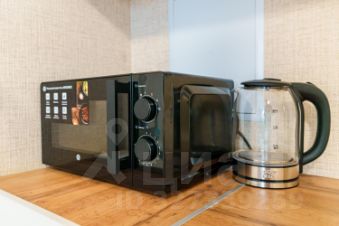 Кухня: вся необходимая техника (холодильник, плита, микроволновка, чайник) и посуда.