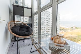 Общая площадь 62 кв.м с двумя изолированными комнатами и тремя застеклёнными балконами с москитными сетками — два с видом на море, один во двор.