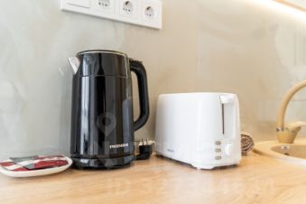 Кухня: вся необходимая техника (холодильник, плита, микроволновка, чайник) и посуда.