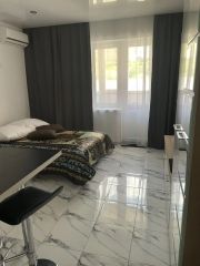 В квартире сделан дизайнерский ремонт, который создаёт уютную и современную атмосферу. В студии есть вся необходимая мебель, как в жилой зоне, так и на кухне. Пространство продумано до мелочей: оборудована кухня с современной техникой, включая холодильник и кондиционер, а также есть стиральная машина и телевизор. В ванной комнате установлена душевая кабина. Один балкон выходит на улицу, что добавляет дополнительное пространство для отдыха.