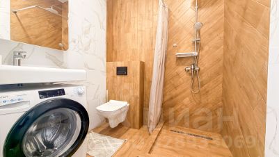 Санузел с душевой кабиной, стиральной машиной и с необходимыми принадлежностями