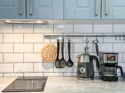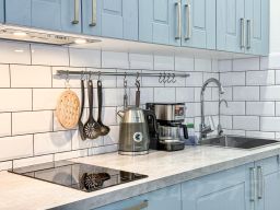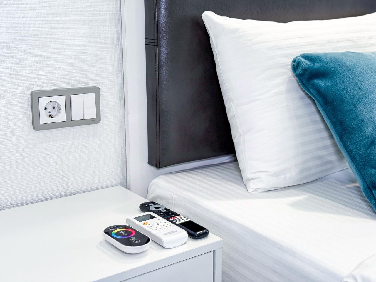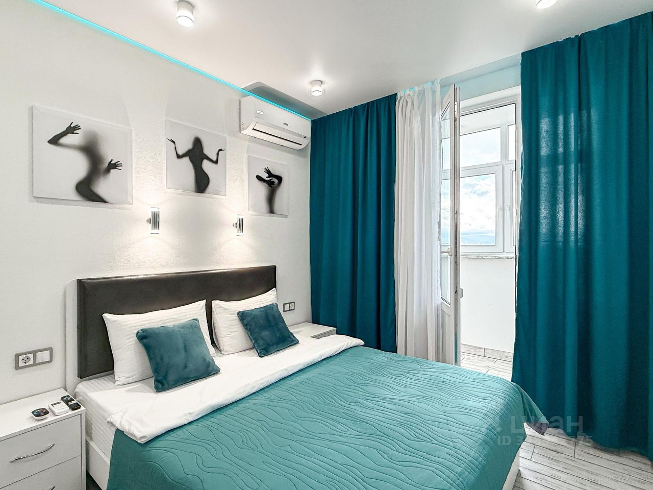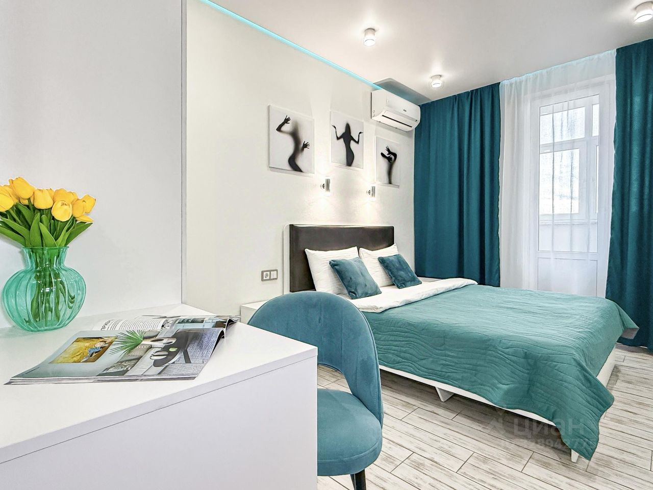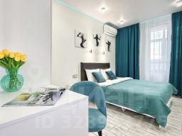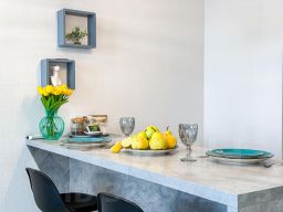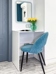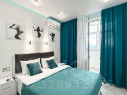 Квартира в бело-бирюзовом цвете с вместимостью до 4 гостей. В квартире есть все, что нужно для комфортного проживания: двуспальная кровать, диван, постельное белье и полотенца, посуда, микроволновка, телевизор, Wi-Fi, стиральная машина, холодильник.