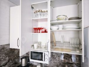 — плита, духовой шкаф, большой холодильник, СВЧ, чайник;