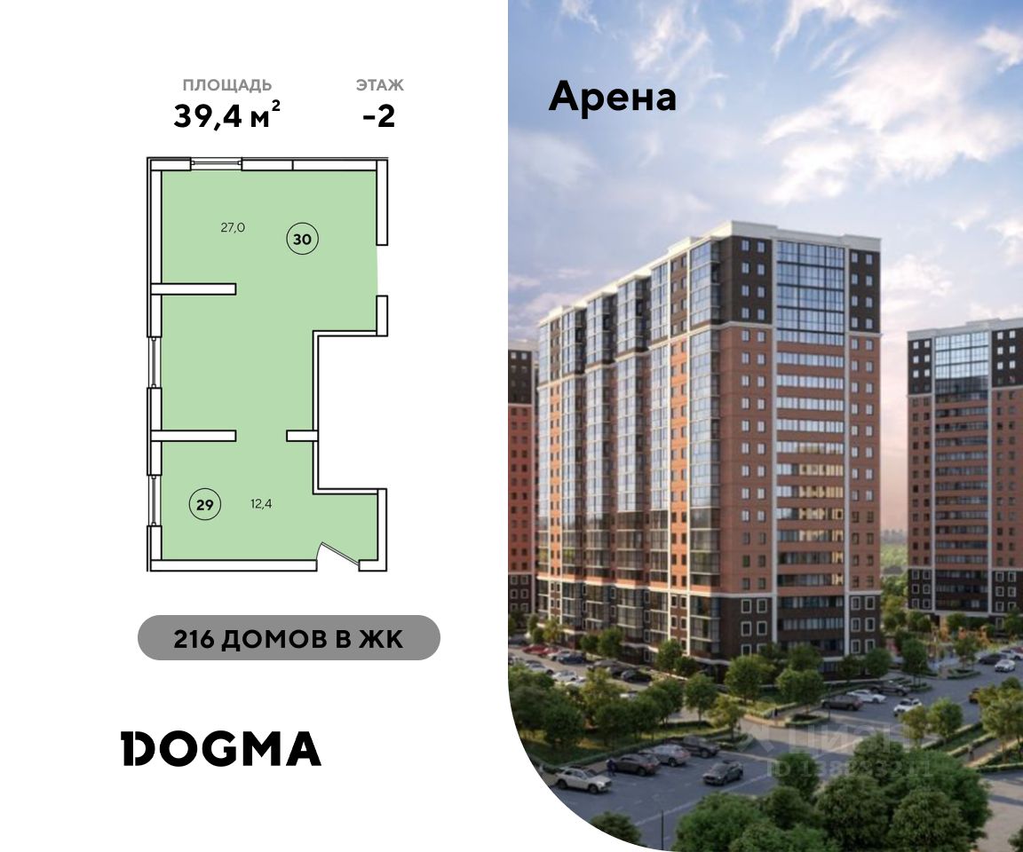 В реализации — коммерческое помещение свободного назначения в литере 1 общей площадью 39.40 кв.м. на -2 этаже от застройщика DOGMA в жилом квартале "Арена", который расположен в г. Новороссийск.