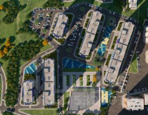 Благоустройство прилегающей территории включает в себя организацию видеонаблюдения, детских и спортивных площадок и зон отдыха. Предусмотрены открытые гостевые парковки и многоуровневый наземный паркинг. Море находится в 15 минутах пешком, рядом с жилым комплексом есть вся необходимая инфраструктура.