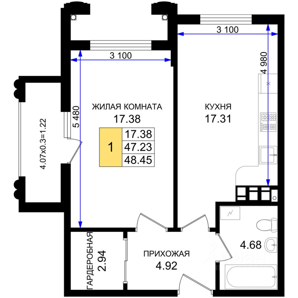 Общая площадь48,45 м²