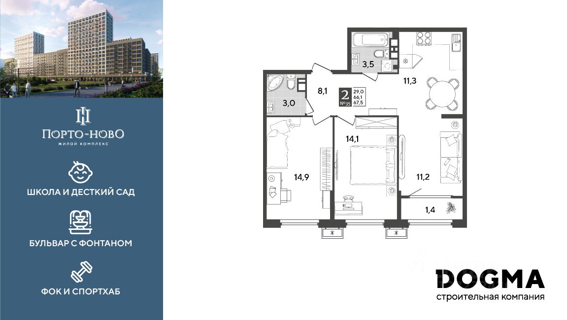 ЖК "Порто-Ново" — новый порт для комфортной жизни. 10 домов переменной этажности с террасами на десятом этаже. Дворы в виде "портов" со своей инфраструктурой: детские и спортивные зоны легко уживаются с зонами отдыха для взрослых, а прогулочный бульвар с фонтаном придаёт кварталу ощущение полноты и гармонии жизни. Школа на 1100 мест, детский сад на 260 мест и физкультурно-оздоровительный комплекс дополняют инфраструктуру всего микрорайона и создают причал для новых возможностей.