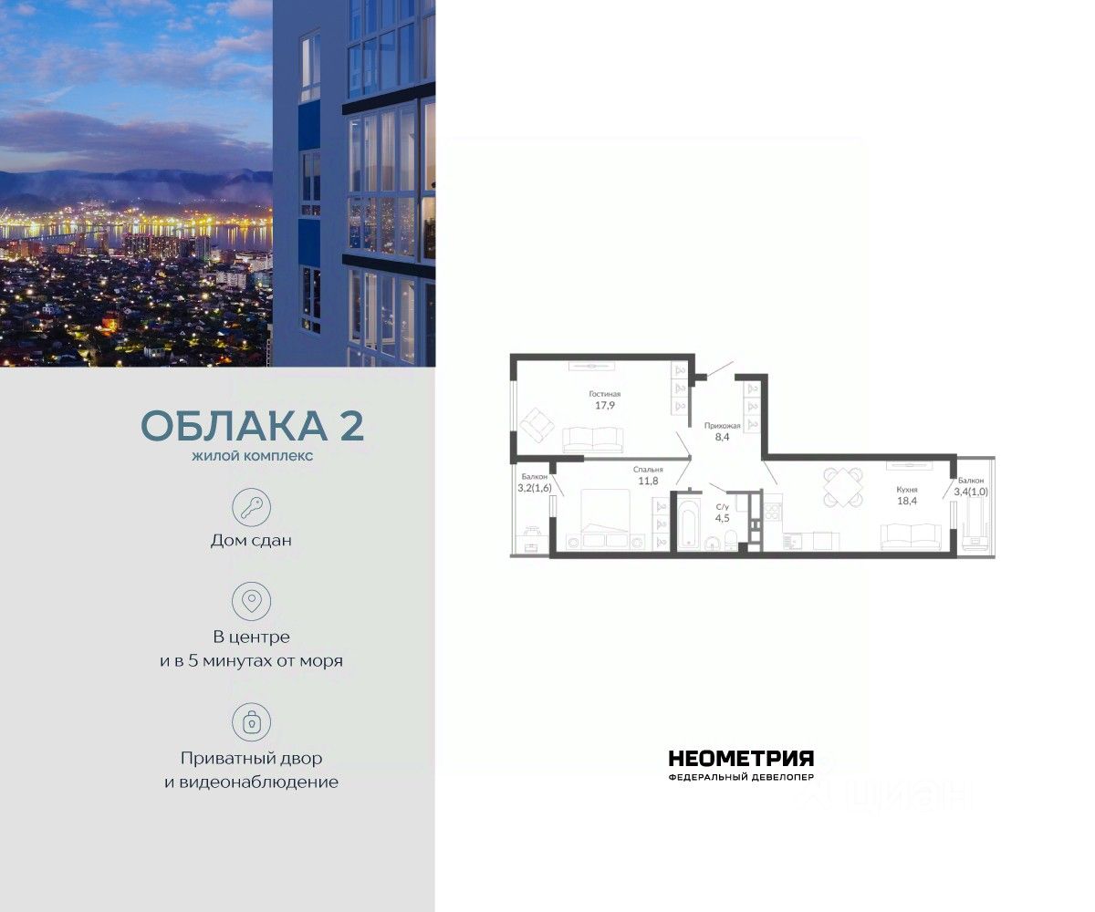 Продается квартира в жилом комплексе "Облака" от федерального девелопера "Неометрия". Современный жилой комплекс расположен на границе Южного и Центрального районов Новороссийска — в развитой, благоустроенной локации всего в 5 минутах езды от моря и центра города. Здесь мягкий климат, чистый воздух и гармоничное сочетание природы и городской инфраструктуры. Всё для комфортной жизни: • Закрытая дворовая территория без машин; • Подземный паркинг с доступом на лифте; • Колясочные в каждом подъезде; • Сквозные входные группы на уровне земли; • Просторные квартиры с видами на горы и море. Современное благоустройство: Во дворах реализована концепция "активити-парка" — это большое зелёное пространство для отдыха и занятий спортом: • Детские площадки, разделенные по возрасту ребенка; • Зоны воркаута, йоги и командных игр, внесенные за периметр двора; • Озеленённые аллеи и уютные места для прогулок; • Общественные огороды для семейного досуга. Развитая инфраструктура в шаговой доступности: • 5 детских садов; • 3 школы; • 5 высших учебных заведений; • 2 поликлиники; • 2 крупных торговых центра; • Супермаркеты и магазины; • Удобные остановки общественного транспорта. Застройка ведётся по 214-ФЗ с использованием эскроу-счетов, что обеспечивает безопасность сделки и прозрачность на всех этапах. • 3 очередь проекта — сдача в IV квартале 2026 года, класс бизнес • 2 очередь — сдана в 2024 г., класс комфорт-плюс • 1 очередь — сдана в 2020 г., класс комфорт-плюс