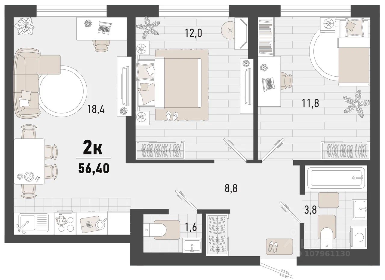 Продается 2-комн. квартира, 56,4 м²