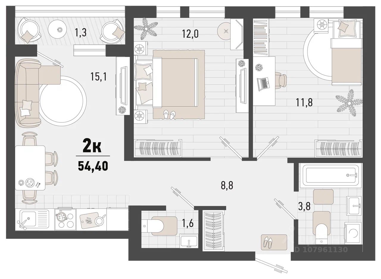 Общая площадь54,4 м²