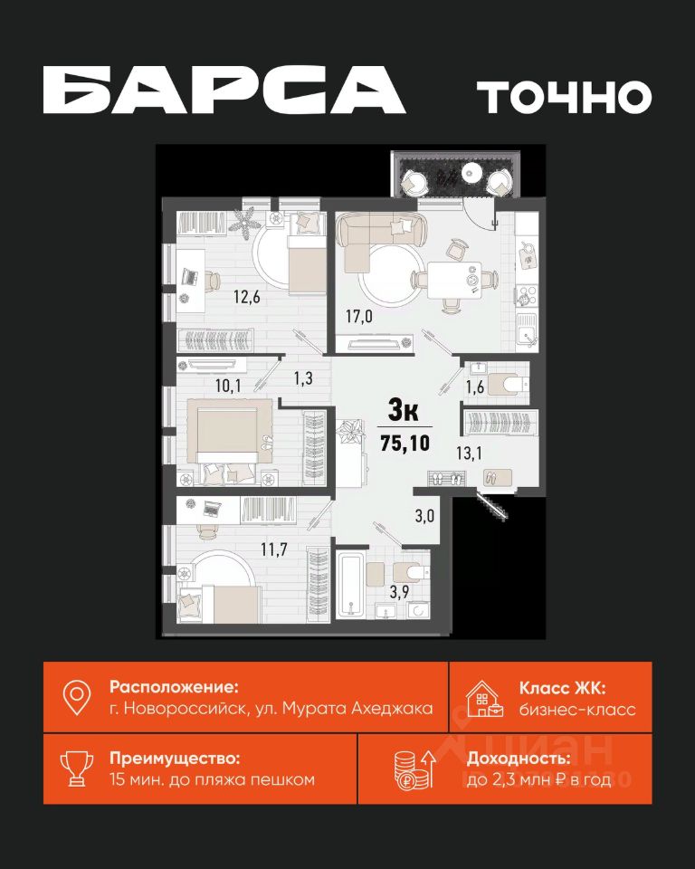Жилой комплекс "Барса" расположился в самом живописном Южном районе Новороссийска, всего в 15 минутах ходьбы от пляжа "Алексино". Море будет видно даже из окон невысоких этажей. Проект объединяет просторные квартиры с панорамными окнами, продуманные зоны отдыха и площадки для спорта, прогулочный бульвар, беседки и уникальные арт-объекты. В жилом комплексе запланированы детский сад на 380 мест и школа на 1 750 мест. Больше не нужно выбирать между жизнью на курорте и в мегаполисе. "Барса" — новый проект для безупречной жизни людей на побережье!
