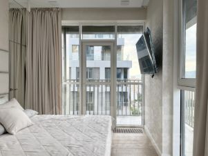 Просторная кухня гостиная и две изолированные спальни. Разделенный санузел, ванная с водопадом и душевая с тропическим душем. Полная шумоизоляция стен.