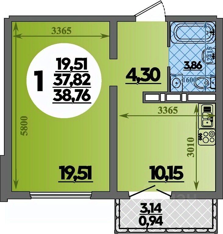 Общая площадь38,76 м²