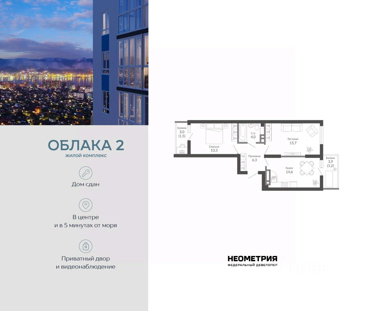 Продается квартира в жилом комплексе "Облака" от федерального девелопера "Неометрия". Современный жилой комплекс расположен на границе Южного и Центрального районов Новороссийска — в развитой, благоустроенной локации всего в 5 минутах езды от моря и центра города. Здесь мягкий климат, чистый воздух и гармоничное сочетание природы и городской инфраструктуры. Всё для комфортной жизни: • Закрытая дворовая территория без машин; • Подземный паркинг с доступом на лифте; • Колясочные в каждом подъезде; • Сквозные входные группы на уровне земли; • Просторные квартиры с видами на горы и море. Современное благоустройство: Во дворах реализована концепция "активити-парка" — это большое зелёное пространство для отдыха и занятий спортом: • Детские площадки, разделенные по возрасту ребенка; • Зоны воркаута, йоги и командных игр, внесенные за периметр двора; • Озеленённые аллеи и уютные места для прогулок; • Общественные огороды для семейного досуга. Развитая инфраструктура в шаговой доступности: • 5 детских садов; • 3 школы; • 5 высших учебных заведений; • 2 поликлиники; • 2 крупных торговых центра; • Супермаркеты и магазины; • Удобные остановки общественного транспорта. Застройка ведётся по 214-ФЗ с использованием эскроу-счетов, что обеспечивает безопасность сделки и прозрачность на всех этапах. • 3 очередь проекта — сдача в IV квартале 2026 года, класс бизнес • 2 очередь — сдана в 2024 г., класс комфорт-плюс • 1 очередь — сдана в 2020 г., класс комфорт-плюс