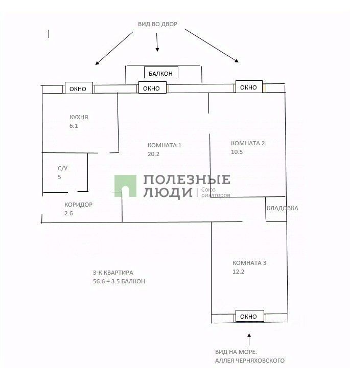 Площадь квартиры: 56,6 м² + балкон 3,5 м²