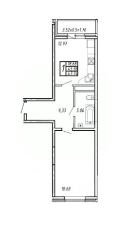 Планировка квартиры на две стороны: просторная комната 18,68 м2, кухня 12,97 м2, санузел совместный, лоджия застеклена выход из кухни. Вид из окон во двор.