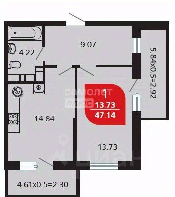 Общая площадь 47,14 кв.м с балконами,